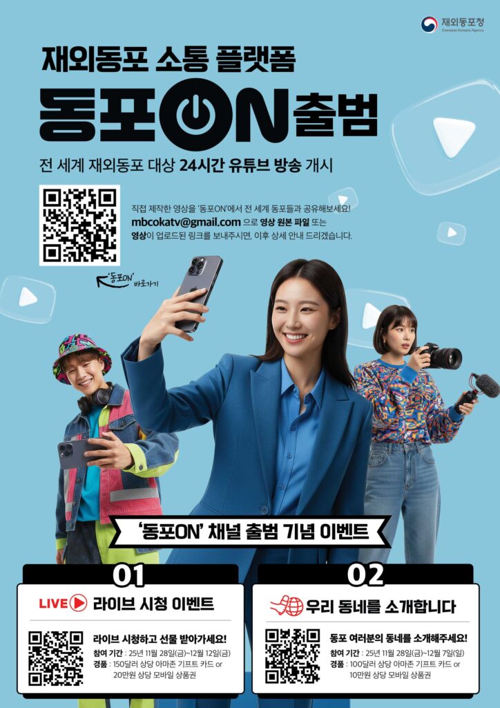 재외동포청은 전 세계 700만 재외동포와의 소통을 강화하고 동포 정책에 대한 접근성을 높이기 위해 재외동포 소통 플랫폼 “동포ON”을 출범하여 재외동포청 유튜브를 통해 24시간 콘텐츠 송출을 시작합니다. 재외동포 여러분들의 많은 관심과 이용 부탁드립니다.
