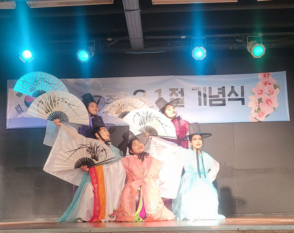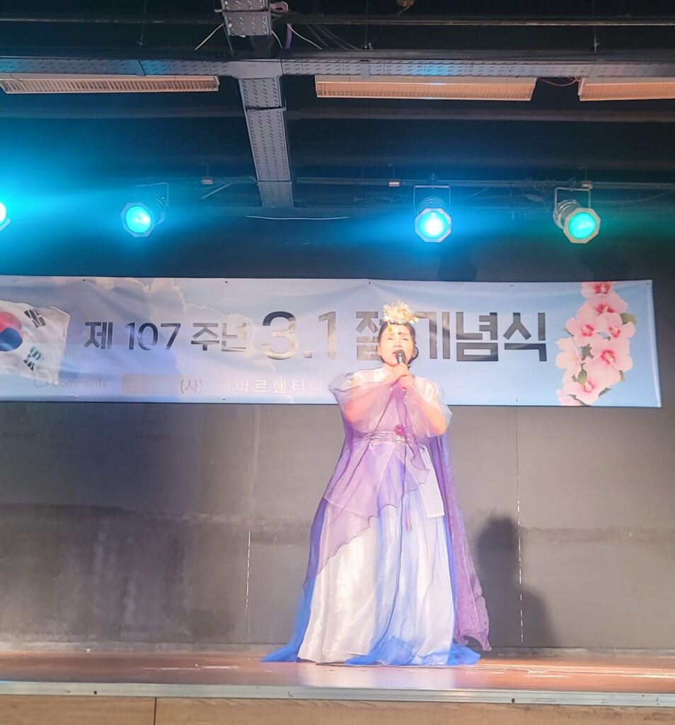 기념식 중간에는 국악원의 특별 공연이 이어져 행사 분위기를 더욱 뜻깊게 했다. 첫 무대에서는 한인과 아르헨티나인 남녀노소가 함께 참여해 장구 8대, 소고 6대, 징 1대로 동요 ‘유관순’을 연주했다. 이어 주영순 국악원장이 정의송 곡 ‘님이여’를 독창했으며, 한인 1명과 아르헨티나인 4명으로 구성된 무용단이 부채춤 공연을 선보여 참석자들의 큰 호응을 얻었다.